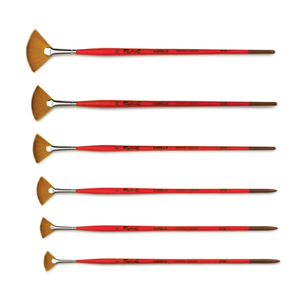 The Kaerell S Synthetic Fan Brush replicates the performance of sable hair. Durable and easy to clean, this brush is suitable for a wide variety of techniques and media. The synthetic filaments taper to a sharp point, the brush strokes are soft and smooth, and line and edges are very precise. Ideal for oils, acrylics and watercolours.